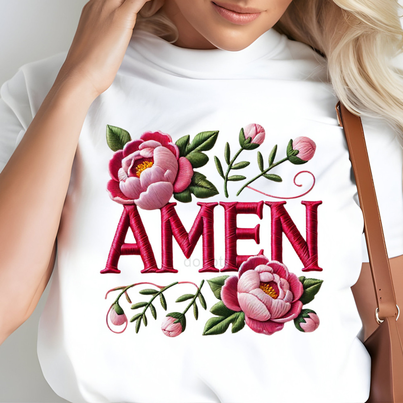 Grace and beauty come together in this stunning “Amen” design, blooming with faith and elegance. Featuring intricate faux-embroidery details and lush pink florals, this piece radiates positivity and praise. The bold stitched-style lettering gives it a handcrafted boutique feel, while the delicate flowers add a touch of feminine charm. Perfect for Sunday mornings, Bible study, or everyday wear that shares your faith with style — this design is a heartfelt reminder to always say “Amen.”