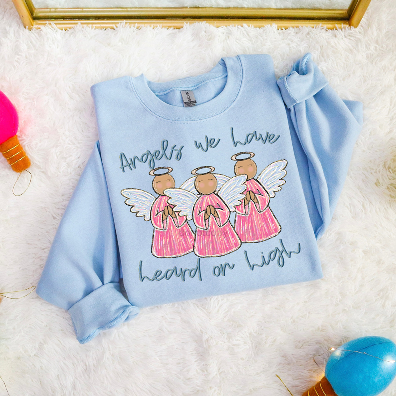 Grace your holiday lineup with heavenly charm in this Angels We Have Heard on High design. Featuring three sweet angels dressed in soft pink robes with delicate wings and halos, this design blends classic Christmas spirit with a modern, hand-drawn look. The script lettering adds a touch of elegance while the pastel tones keep it light, joyful, and boutique-chic. Perfect for candlelight services, Christmas concerts, or cozy evenings by the tree, this angelic favorite captures the beauty and peace of the season in the sweetest way.