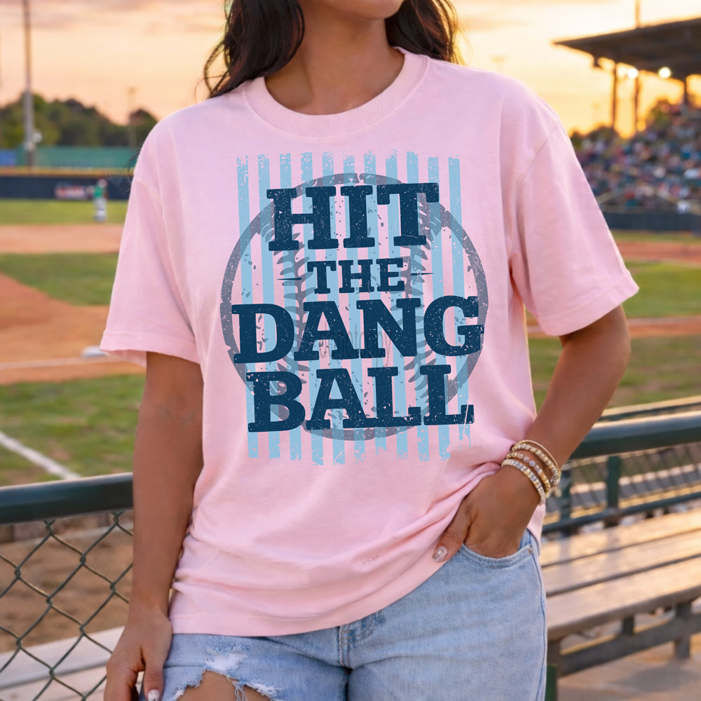 This fun baseball-inspired design features the bold phrase “Hit the Dang Ball” layered over a distressed baseball graphic with soft vintage-style stripes in the background. The stacked lettering and textured details give the design a classic game day look while keeping the message front and center.