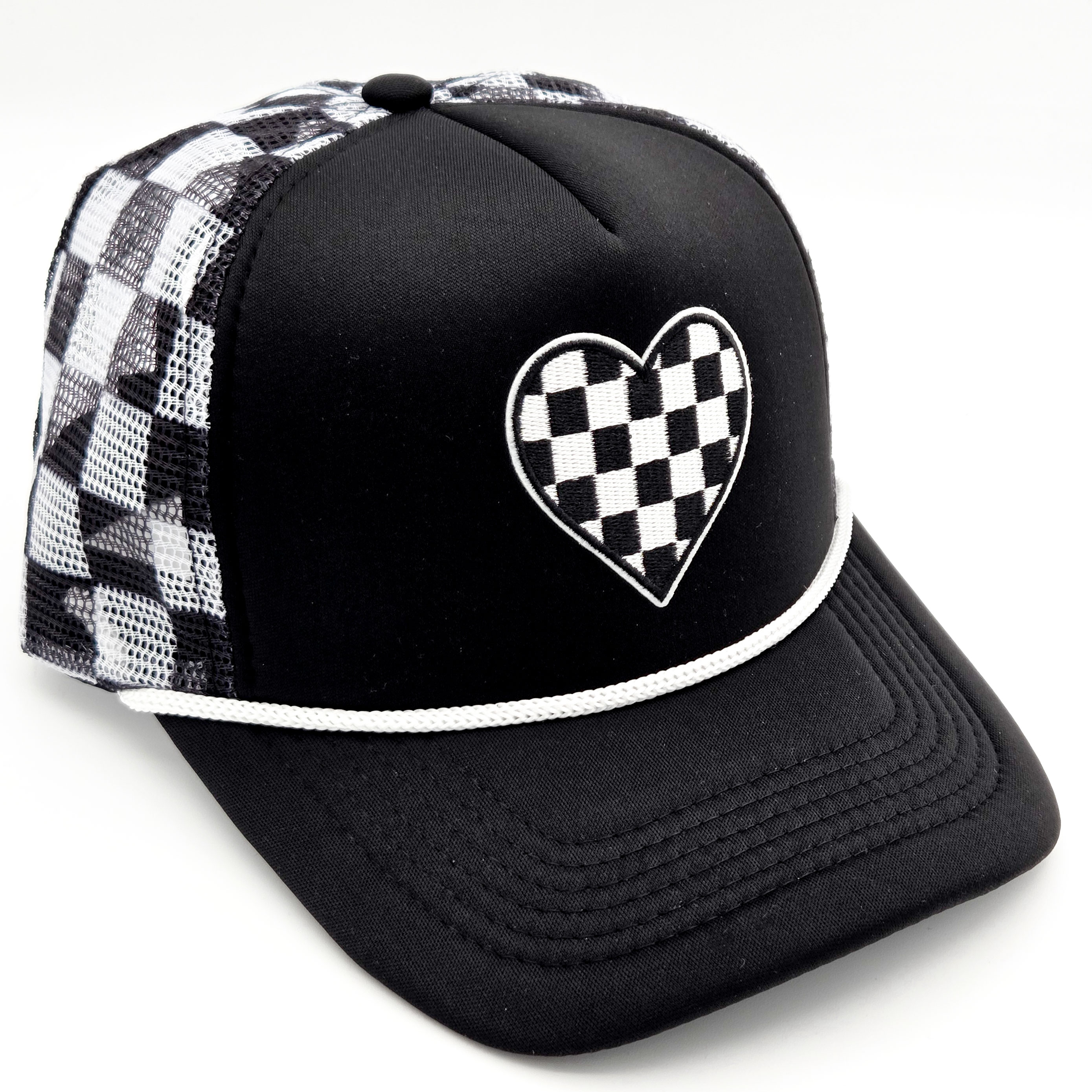 The black and white checkered hat pairs perfectly with our adorable black and white checkered heart.