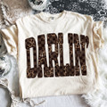 This bold “Darlin’” design blends western charm with a trendy mixed-print twist. The oversized lettering features a rich combination of checkered and leopard patterns in warm, neutral tones, giving it that effortless boutique feel. The contrast between the prints adds depth and texture, while the slightly distressed look keeps it relaxed and lived-in.