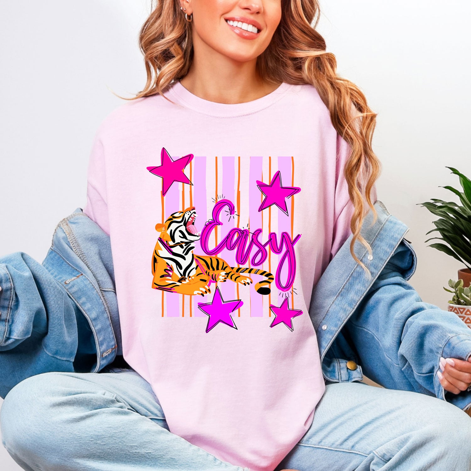 This bold “Easy” design mixes fierce energy with playful color for a standout look. The illustrated tiger brings movement and attitude, while the bright pink script layered over striped details adds a fun, retro-inspired contrast. Pops of neon stars give it that extra edge, blending wild and carefree vibes into one eye-catching graphic that feels both strong and effortlessly cool.