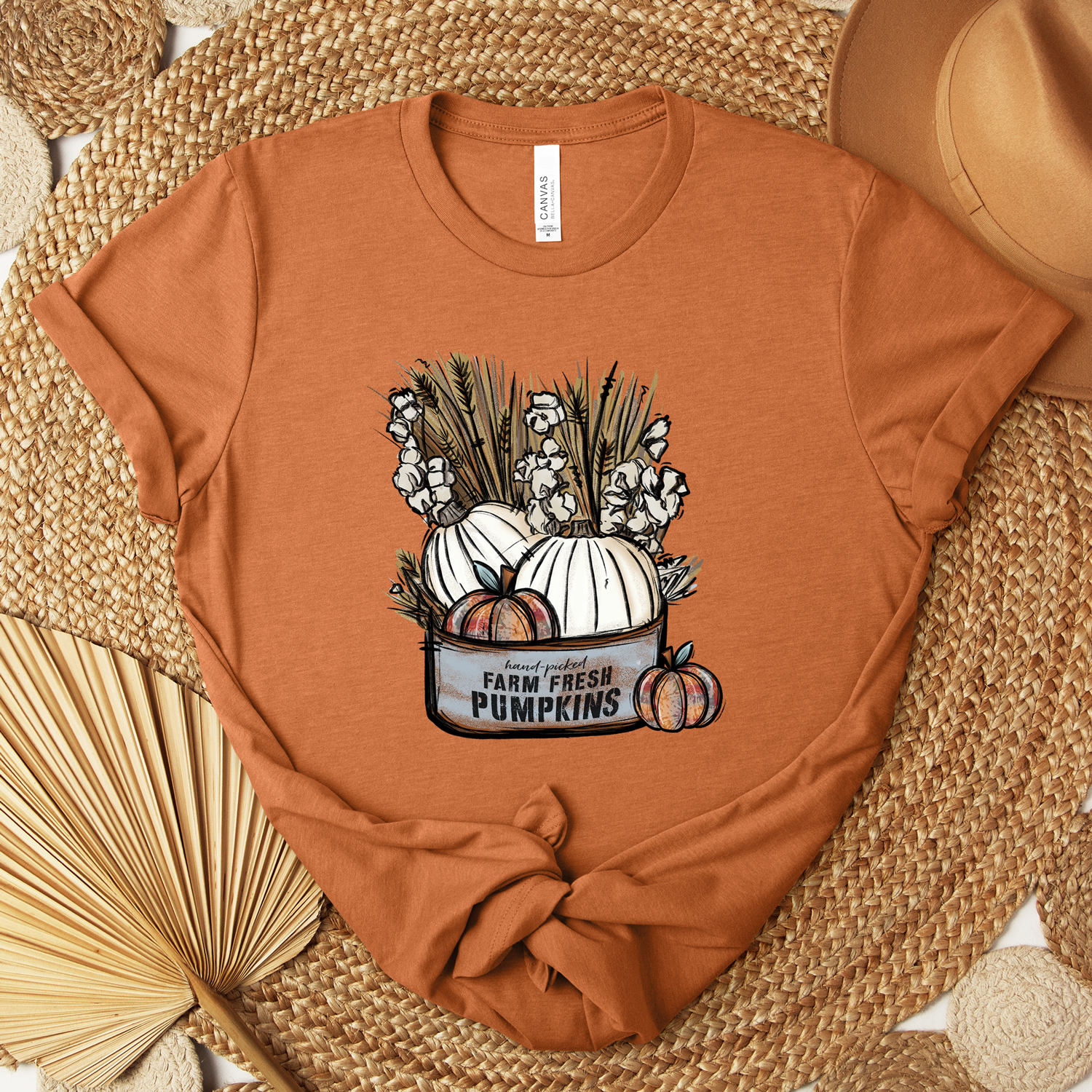 Bring farmhouse charm to your fall wardrobe with this “Farm Fresh Pumpkins” tee. Featuring a rustic bucket filled with white and orange pumpkins, cotton stems, and wheat sprigs, this design captures the cozy feel of autumn days spent at the pumpkin patch. The hand-lettered “Farm Fresh Pumpkins” text adds a vintage touch, making it perfect for anyone who loves harvest season, farmhouse style, and all things pumpkin.