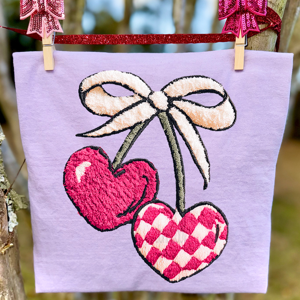 This cherry bow design brings all the Valentine charm with a playful, boutique twist. Featuring two heart-shaped cherries—one solid and one gingham—tied together with a soft, oversized bow, this design blends sweet details with cozy texture. The faux chenille style gives it that plush, touchable look shoppers love, while the bold pinks and soft neutrals keep it fun without feeling overdone. It’s the kind of piece that feels festive but still easy to wear beyond Valentine’s Day.