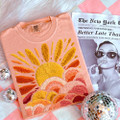 This bold, faux textured sunset design brings warm, retro energy to life. A radiant golden sun rises over curved, stacked hills in shades of mustard, burnt orange, coral, and deep rust. Each section is filled with a faux texture that mimics a hand-stitched, boucle-inspired look, giving the artwork depth and movement. The radiating sunbeams stretch outward in a fan shape, creating a strong focal point with a vintage 70s feel. It’s a statement graphic that blends cozy texture with earthy, modern color tones.