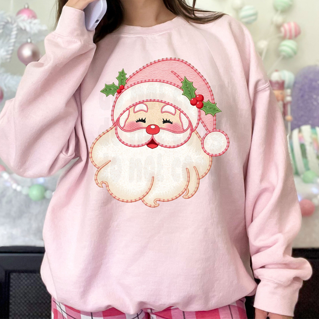 Add a little sweetness to your holiday wardrobe with this charming Faux Embroidered Pink Santa design. Featuring a jolly Santa with rosy cheeks, soft pink tones, and delicate faux embroidery detailing, this design blends classic Christmas cheer with a pastel boutique twist. The holly accents and cozy stitching effect give it that handcrafted feel that’s perfect for the season. It’s festive, feminine, and irresistibly cute — the perfect choice for those who love their Christmas spirit wrapped in pink!