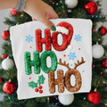 This festive tee brings all the cozy Christmas energy with a playful faux-yarn HO HO HO design that looks soft, dimensional, and totally handcrafted — without the bulk of a real textured patch. Each letter is styled with its own personality, from the fluffy faux-stitched Santa hat to the fuzzy antler details and holly accents. The bright holiday colors pop beautifully and give the whole graphic that warm, crafty feel that shoppers love during the season. It’s a fun, cheerful piece that instantly dresses up any casual outfit and makes a perfect go-to for parties, photos, and everyday holiday spirit.