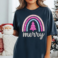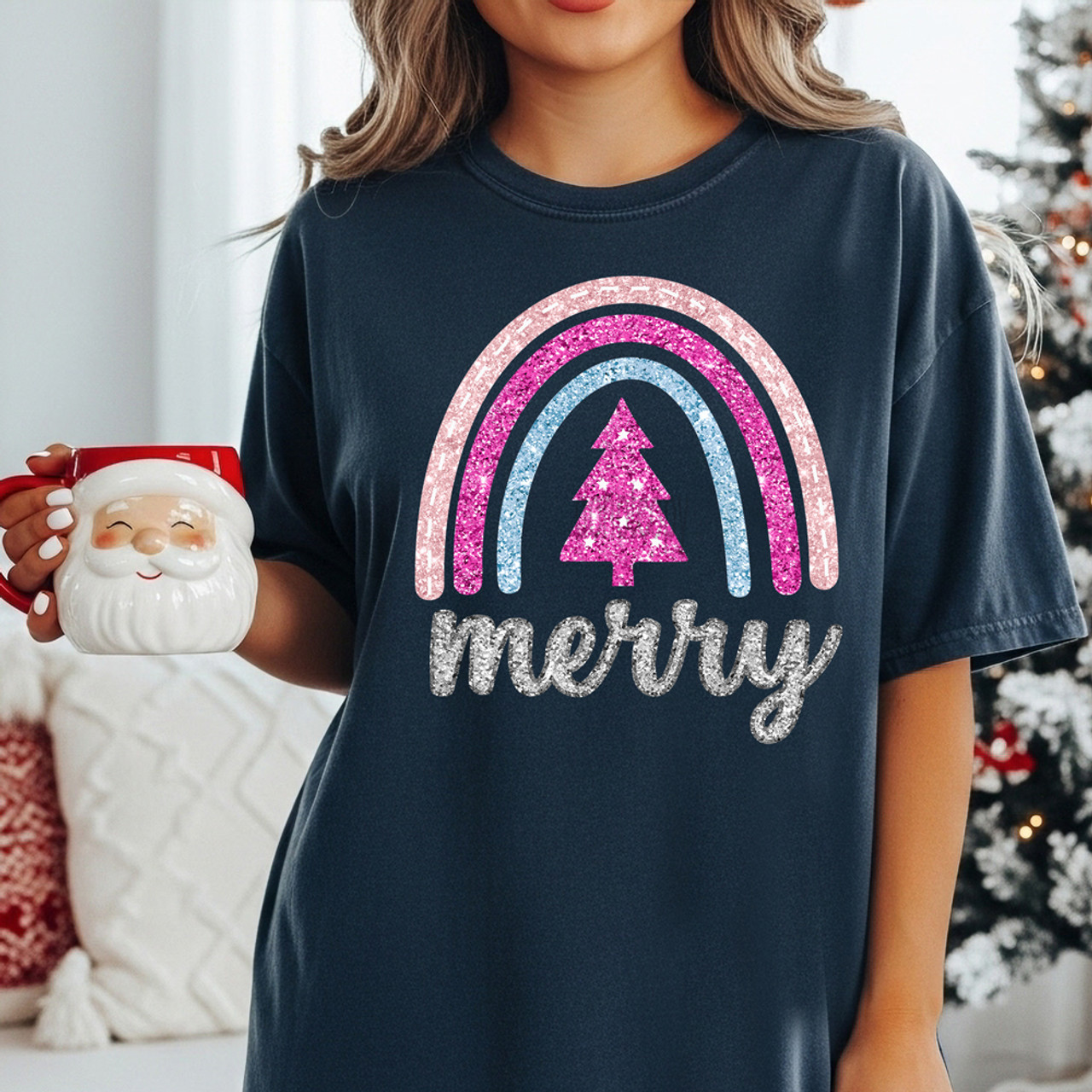 Add a little faux sparkle to your season with this “Merry” rainbow Christmas tee. Featuring faux shimmery pink, silver, and blue faux glitter accents with a festive tree nestled in the arch, this design is the perfect mix of playful and chic. It’s the ideal look for those who love holiday cheer with a pop of color and a boutique twist—merry, modern, and made for spreading joy all winter long.