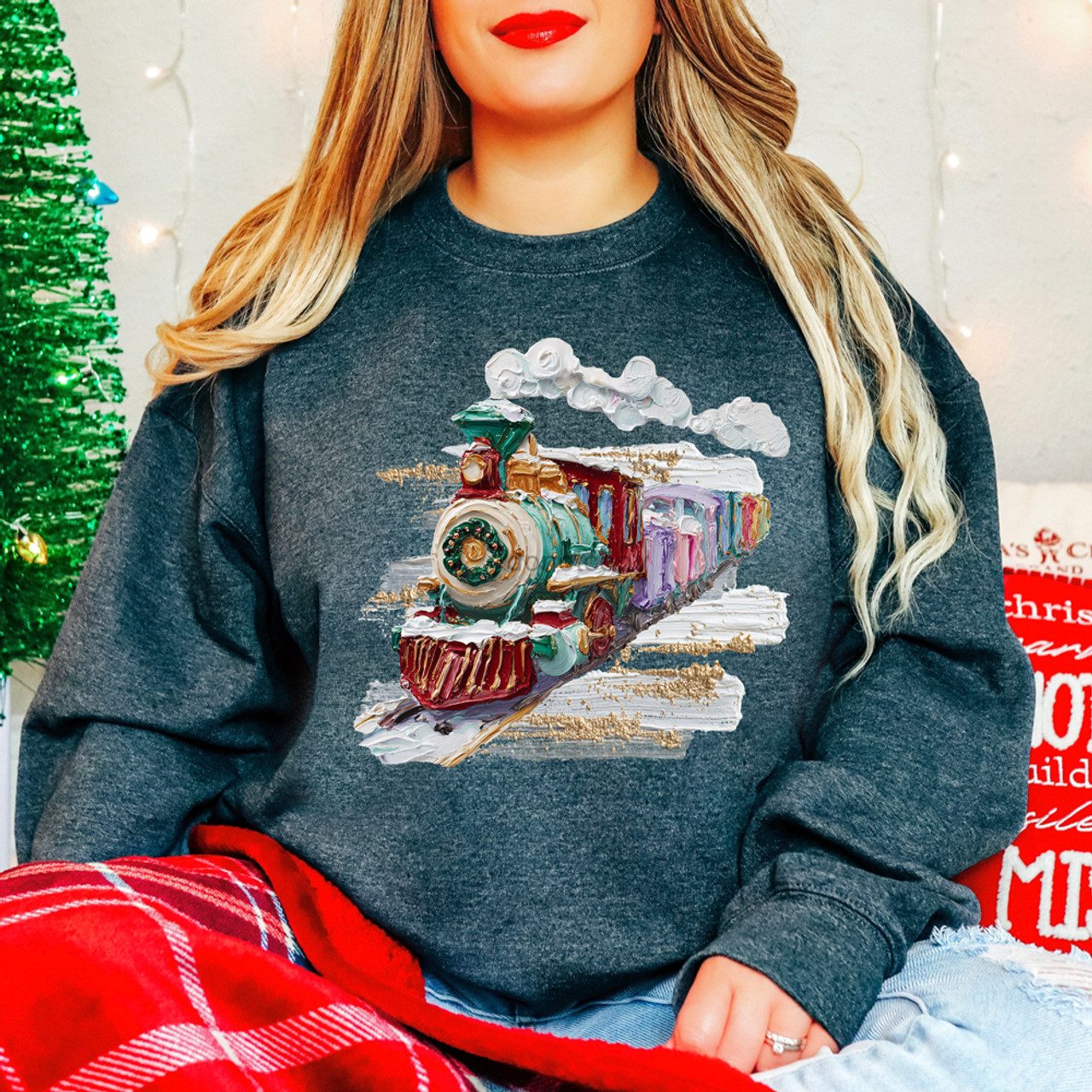 All aboard the holiday express with this faux Hand-Painted North Pole Train design — a stunning blend of artistry and Christmas magic. The faux brushstroke style captures every detail of the festive train, from the faux gold accents to the colorful train cars rolling through a snowy winter scene. It’s nostalgic, whimsical, and full of seasonal warmth — perfect for cozy nights, Christmas movie marathons, or festive family gatherings. This boutique-inspired design brings a touch of vintage Christmas charm to your wardrobe and is sure to be a favorite year after year.