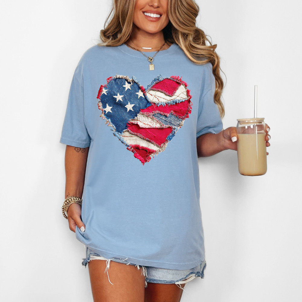 This design blends vintage Americana charm with a soft, worn-in look that feels timeless and effortlessly cool. The faux patchwork heart features faux textures and classic red, white, and blue tones, giving it a handcrafted, nostalgic feel that stands out without being loud. It’s the kind of piece that feels meaningful yet easy — perfect for summer holidays, everyday patriotism, or simply showing love in a subtle, stylish way.