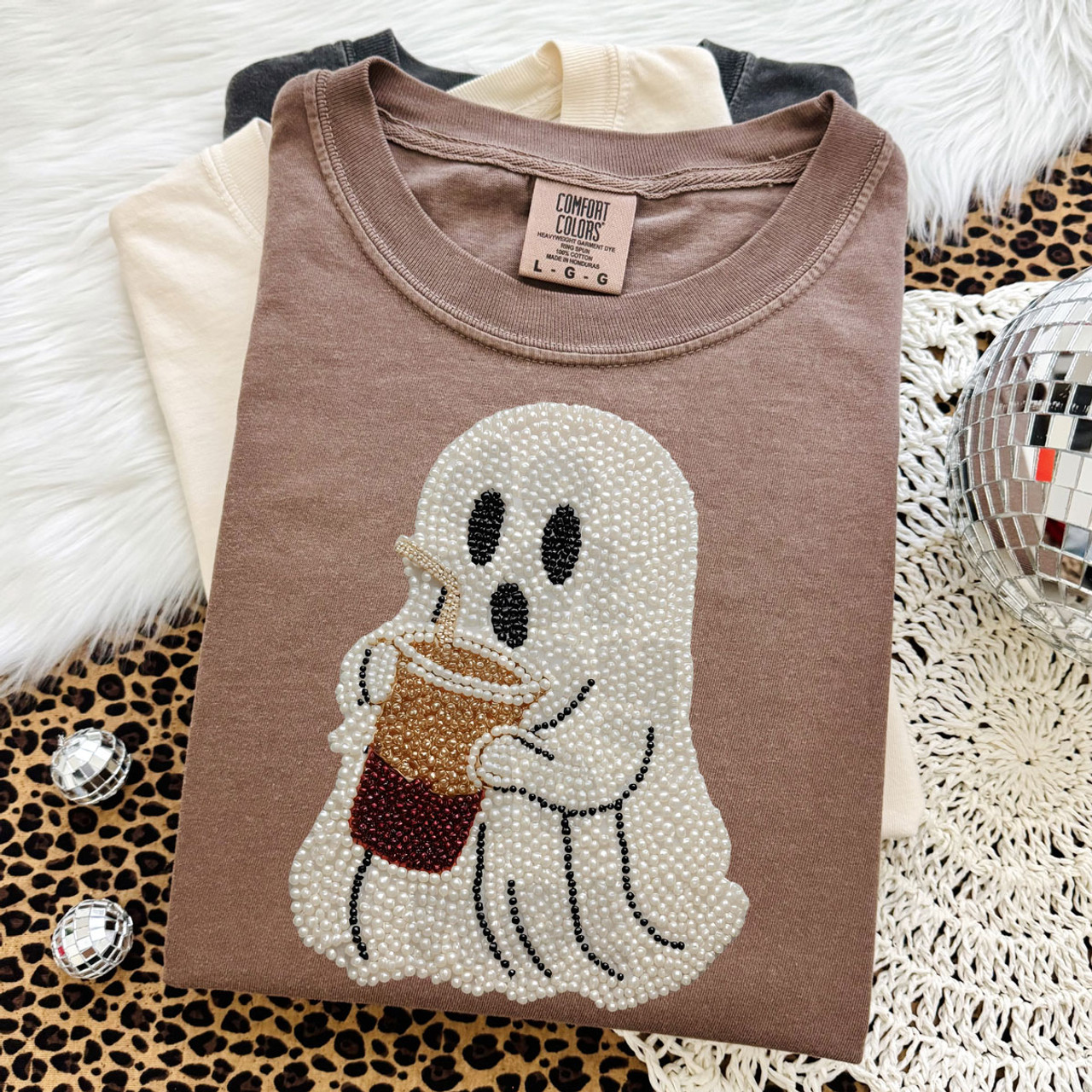 Sip, sparkle, and spook in style with this adorable Pearl Ghost design. Featuring a cozy ghost holding a coffee cup, crafted in a faux pearl texture that shimmers like a beaded masterpiece, this design blends glam with ghostly charm. It’s equal parts cute and caffeinated — perfect for those who live for pumpkin spice season, cozy mornings, and a little bit of sparkle with their spooky.