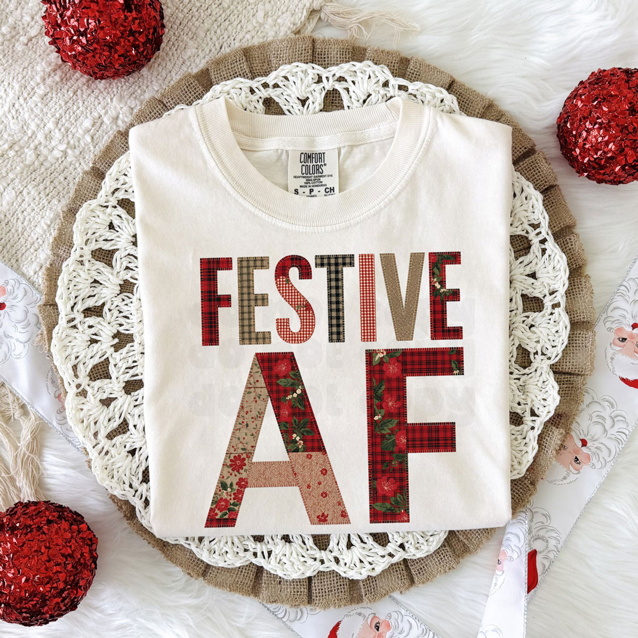 For those who take holiday spirit seriously, this Festive AF design says it all. Featuring bold block letters in a mix of plaid, quilted, and floral holiday patterns, it perfectly blends cozy textures with cheeky personality. The rich reds, greens, and neutrals give it that vintage Christmas charm while keeping it stylish and fun. Whether you’re baking cookies, decorating the tree, or running the holiday party circuit, this design is made for the ones who are unapologetically Festive AF.