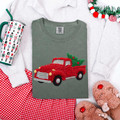 Bring the nostalgia of a country Christmas to life with this faux tufted red truck tee! The faux textured design features a classic red pickup carrying a green Christmas tree in the back—each detail crafted with cozy yarn texture for that warm, handmade feel. Set against a soft sage backdrop, it’s a festive favorite that blends rustic charm with boutique flair. Perfect for Christmas markets, cocoa dates, or lounging by the fire in true holiday style.