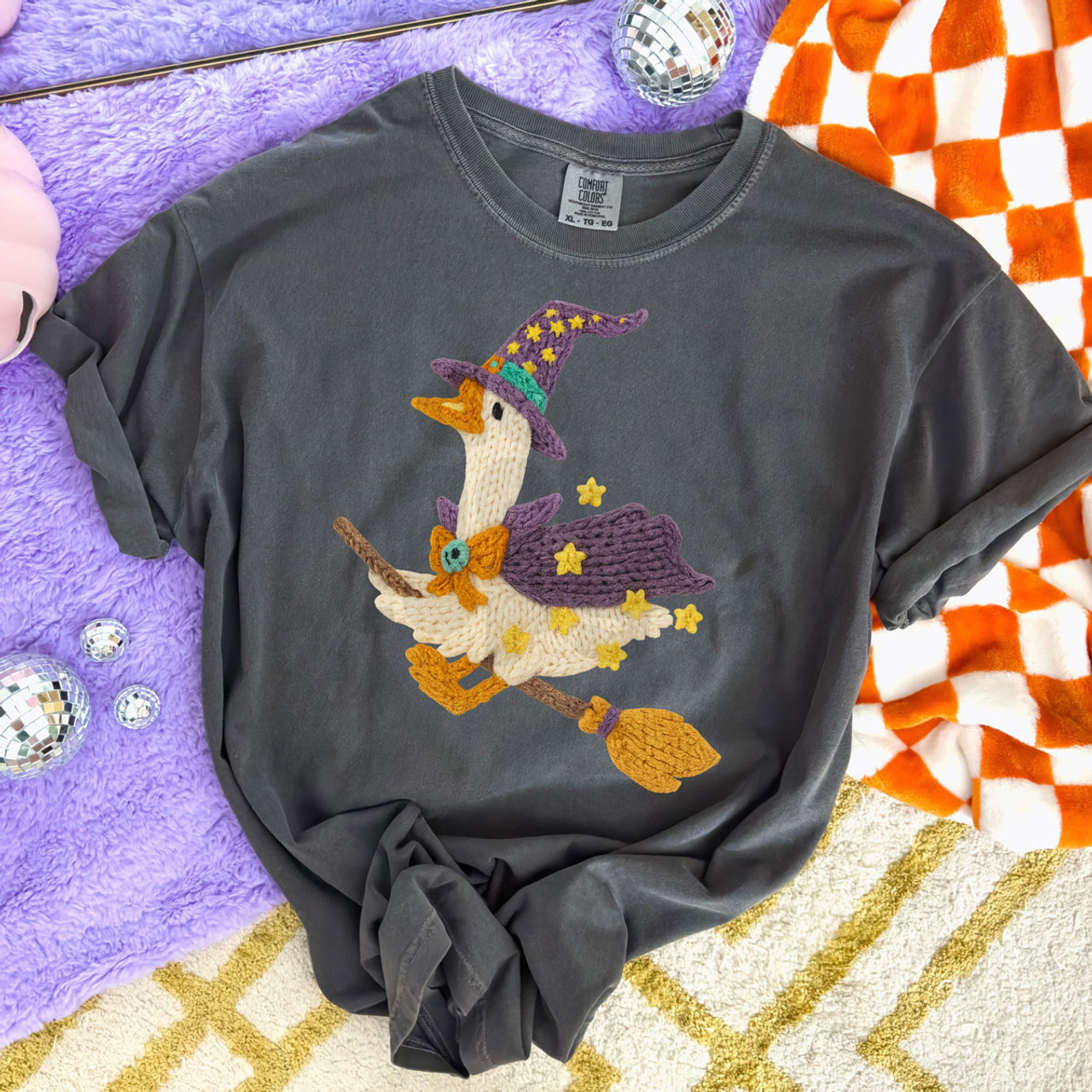 The Witchy Goose design brings a whole new level of charm to spooky season! This cozy faux yarn graphic features an adorable goose soaring on a broomstick, decked out in a starry purple witch hat and matching cape. It’s a little bit whimsical, a little bit witchy, and totally irresistible for fall lovers who like their Halloween style on the fun and cozy side. Perfect for adding a touch of playful magic to your seasonal lineup.