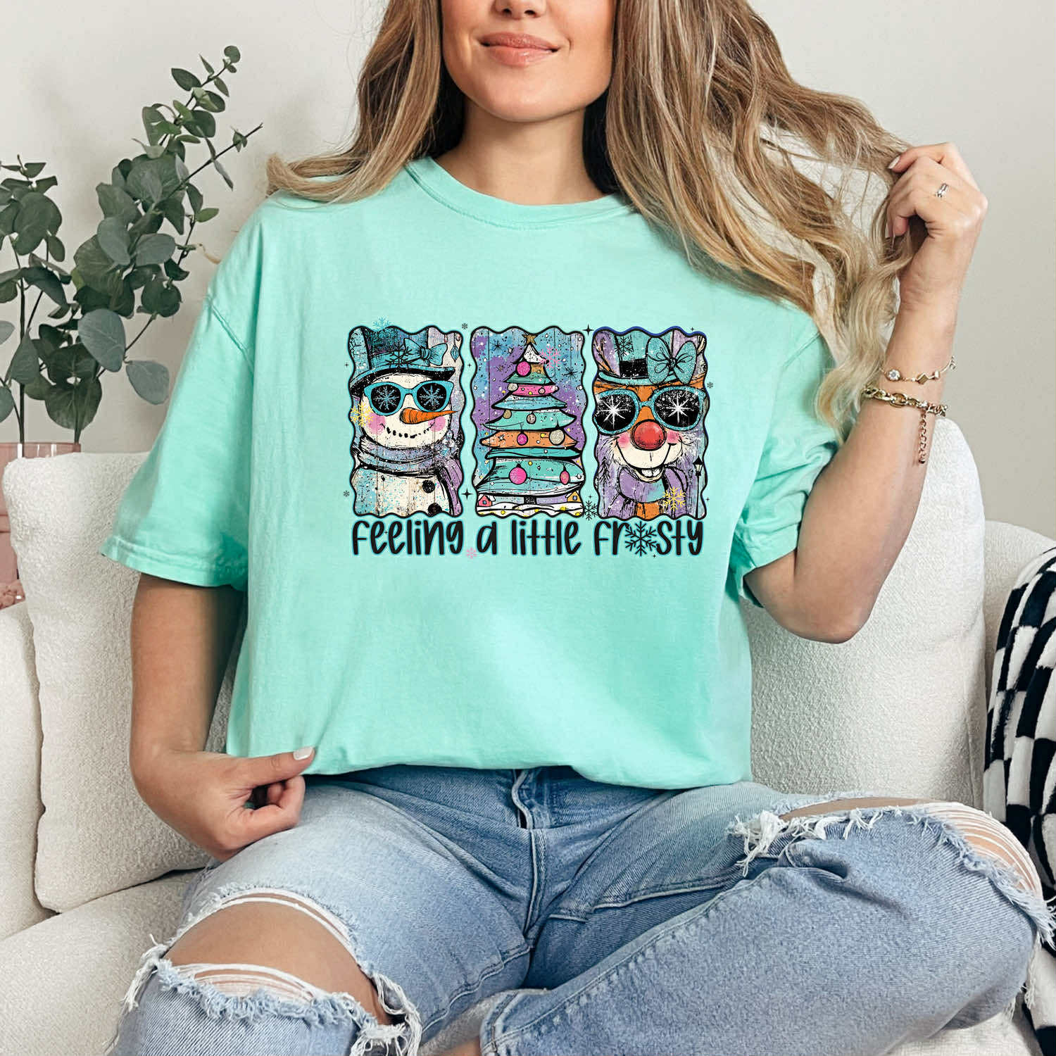 Spread some cool holiday cheer with this Feeling a Little Frosty tee! Featuring a fun trio of frosty friends — a snowman, a Christmas tree, and a reindeer — each decked out in shades of teal, pink, and purple, this design captures a playful winter vibe. The retro distressed texture adds just the right touch of vintage flair while keeping things bright and merry. Perfect for anyone who loves bold holiday style with a touch of sass and sparkle.