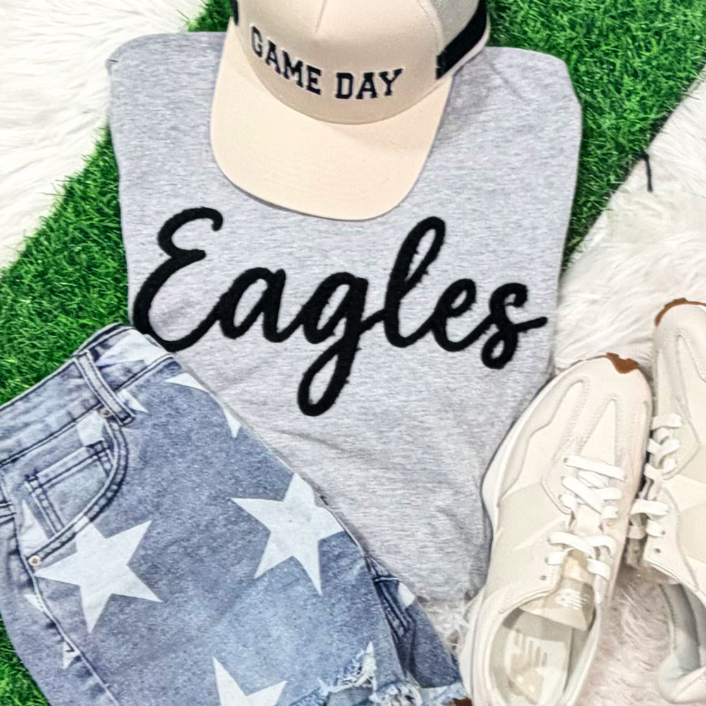 This spirited graphic features the word “Eagles” written in a bold flowing script that creates a classic and stylish game day look. The smooth cursive lettering stretches across the design with balanced curves and thick strokes, giving the mascot name a confident presence while keeping the overall layout clean and timeless.