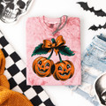Playful meets spooky with this quirky Halloween design featuring two jack-o’-lanterns styled like cherries, tied together with a bold orange bow and leafy green stems. The retro-inspired artwork brings a unique twist to pumpkin season, making it the perfect mix of cute and creepy. Whether you’re headed to a fall festival, carving pumpkins, or just want to stand out during spooky season, this design is sure to turn heads.