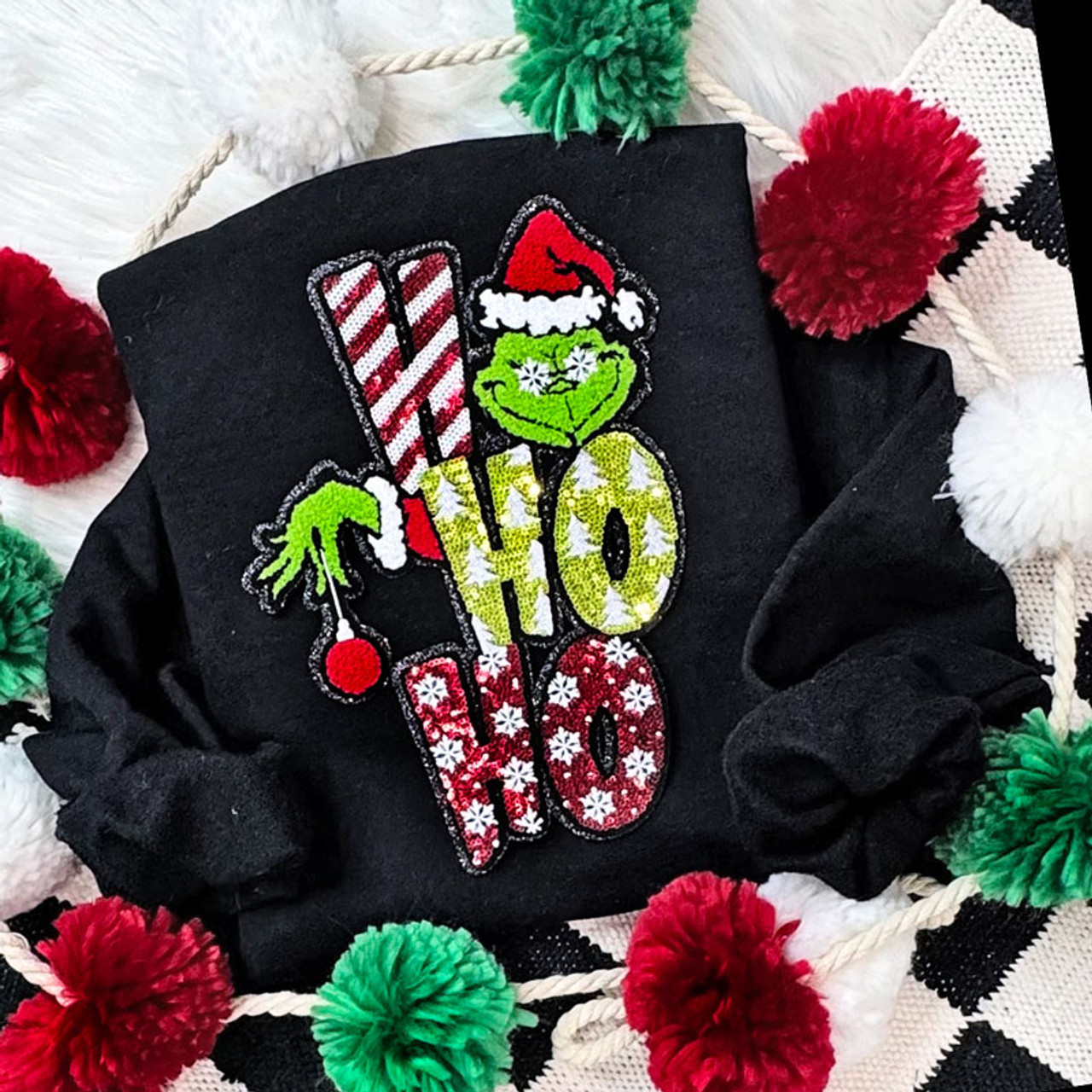 Bring some sassy sparkle to your holiday wardrobe with this Ho Ho Ho Sequin design! Featuring a mischievous green grin in a Santa hat, this glittering Christmas graphic blends red, white, and green sequin patterns with bold festive flair. The textured sparkle and playful personality make it a perfect pick for holiday parties, casual winter days, or spreading a little cheeky Christmas cheer. It’s the perfect mix of naughty and nice!