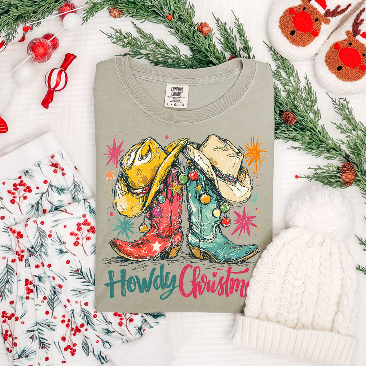 Kick up some holiday cheer with this Howdy Christmas Tee! Bursting with bold color and western flair, it features a pair of festive cowboy boots and hats decked out in ornaments and twinkling stars. The playful “Howdy Christmas” script adds the perfect touch of southern charm. Ideal for cowgirls, rodeo lovers, or anyone bringing a little country spirit to the holidays, this tee makes every celebration feel merry and bright—Texas style!