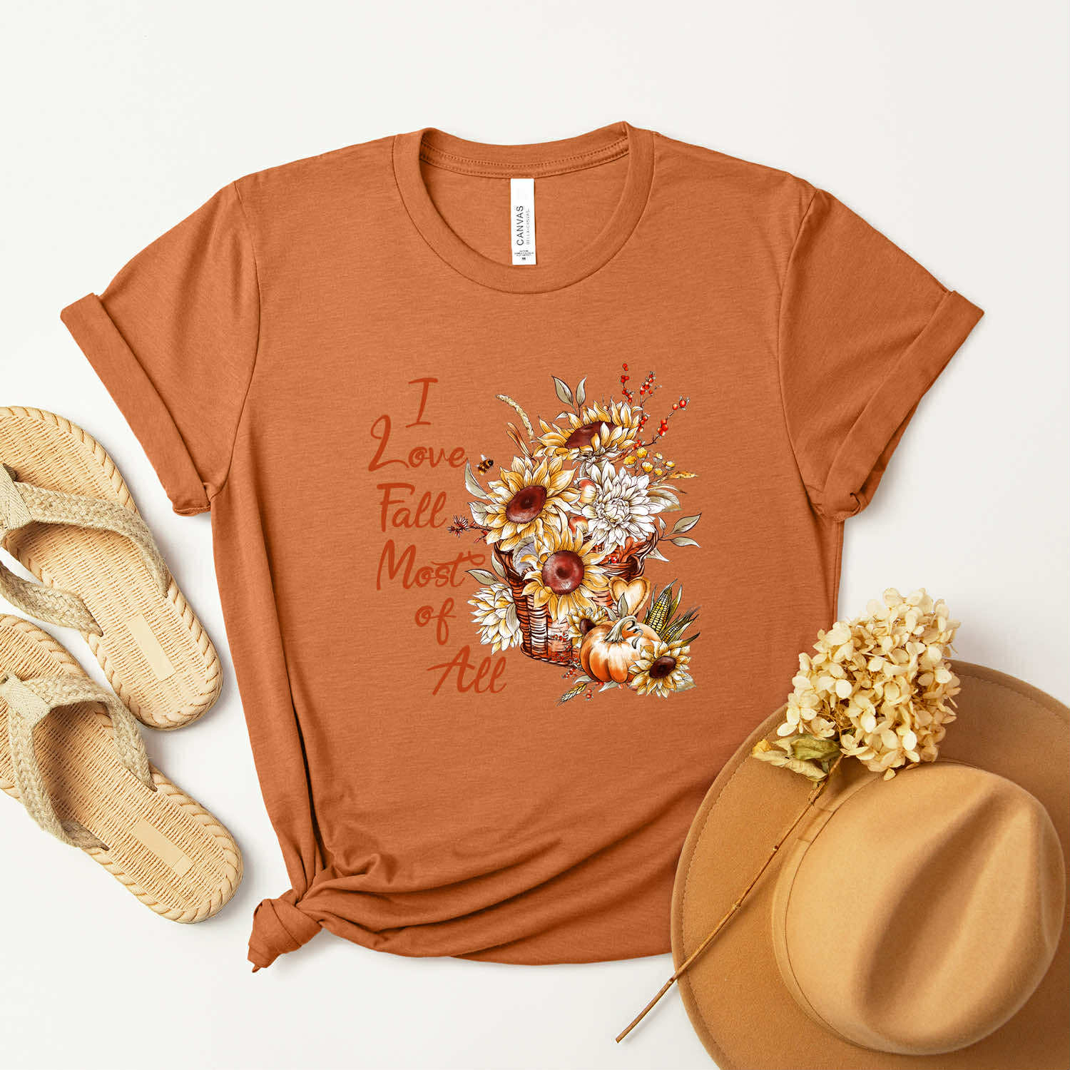 Capture the magic of the season with this “I Love Fall Most of All” tee. This charming autumn design features a rustic basket overflowing with sunflowers, pumpkins, and fall florals in warm golden tones — a picture-perfect nod to cozy days and harvest gatherings. Whether you’re sipping cider, strolling through the pumpkin patch, or decorating your porch with mums, this tee brings all the cozy fall feels in one boutique-inspired look.
