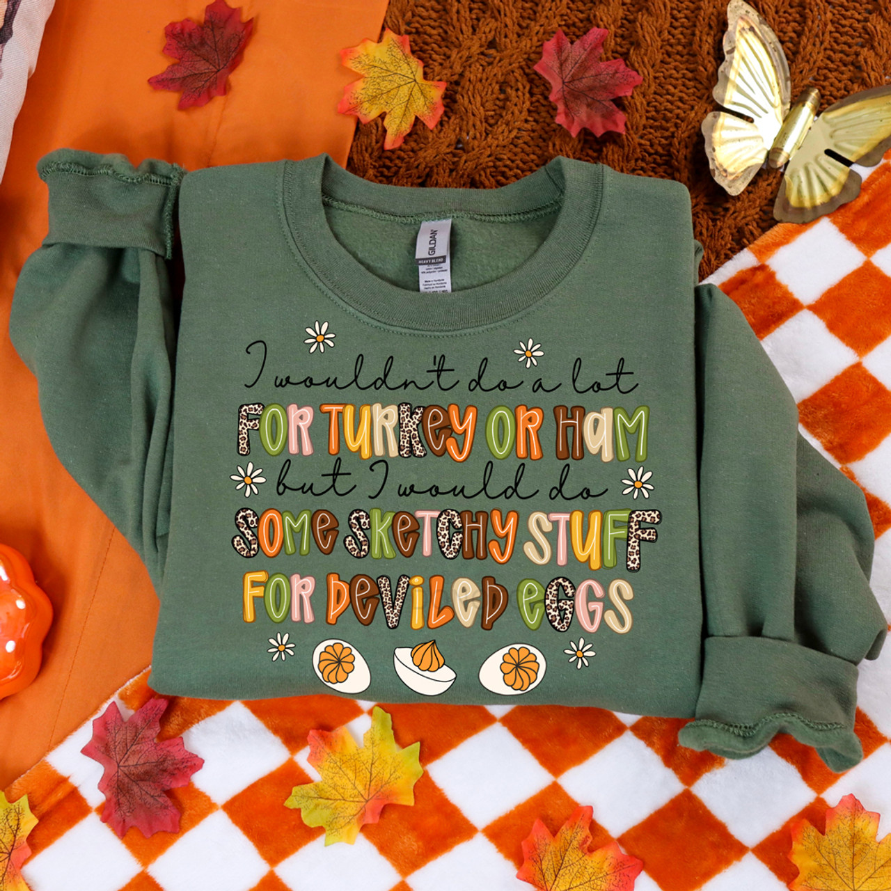 This “I Wouldn’t Do a Lot for Turkey or Ham, but I Would Do Some Sketchy Stuff for Deviled Eggs” sweatshirt is the ultimate Thanksgiving mood. Featuring playful fall lettering with pops of leopard print, daisies, and illustrated deviled eggs, it’s a cozy and hilarious nod to everyone’s favorite holiday snack. Perfect for food lovers who don’t take the season too seriously, this sweatshirt brings humor and comfort to every Friendsgiving, family dinner, or laid-back fall day.