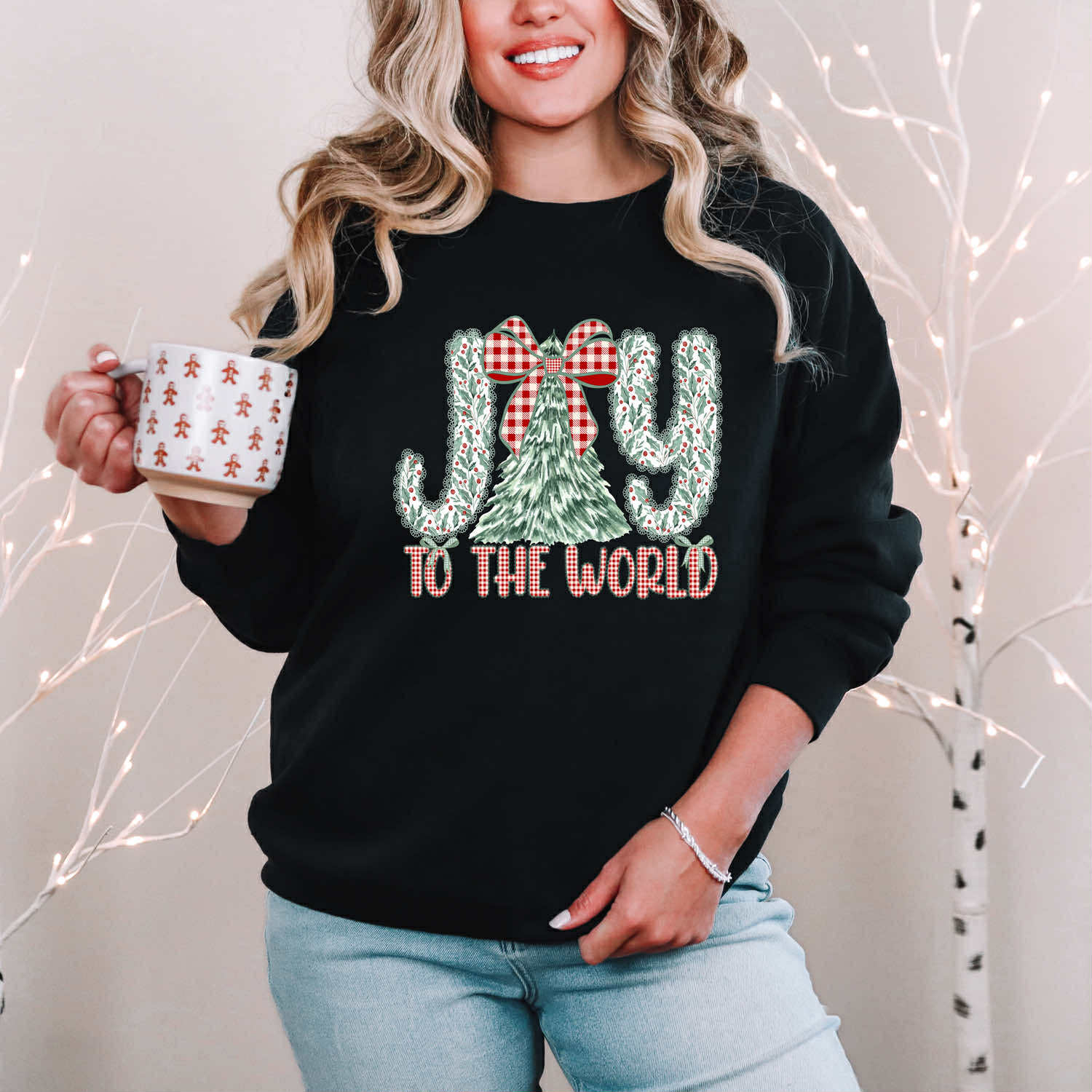 Spread holiday cheer with this Joy to the World sweatshirt — a festive blend of classic charm and cozy boutique style. The design features the word “JOY” crafted in textured, faux-stitch details with a Christmas tree taking center stage, topped with a red gingham bow. Soft, traditional hues of green and red give it that timeless feel while still feeling trendy and fun. Perfect for Christmas gatherings, baking days, or simply sipping cocoa while watching the snow fall.