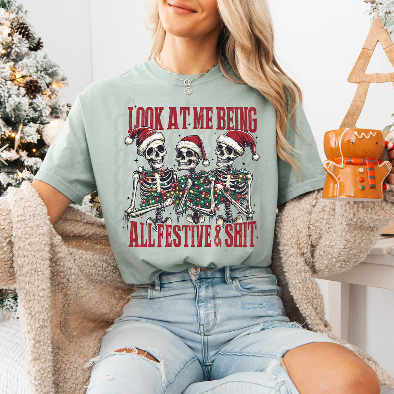 Bring the sarcasm to the season with this Look at Me Being All Festive & Shit tee — the perfect blend of humor and holiday spirit. Featuring three skeletons rocking Santa hats and tangled in Christmas lights, this design gives the holidays a playful, rebellious twist. It’s ideal for anyone who loves Christmas but prefers a little edge with their cheer. A fun conversation starter for holiday parties, cookie swaps, or cozy nights in with a spiked cocoa.