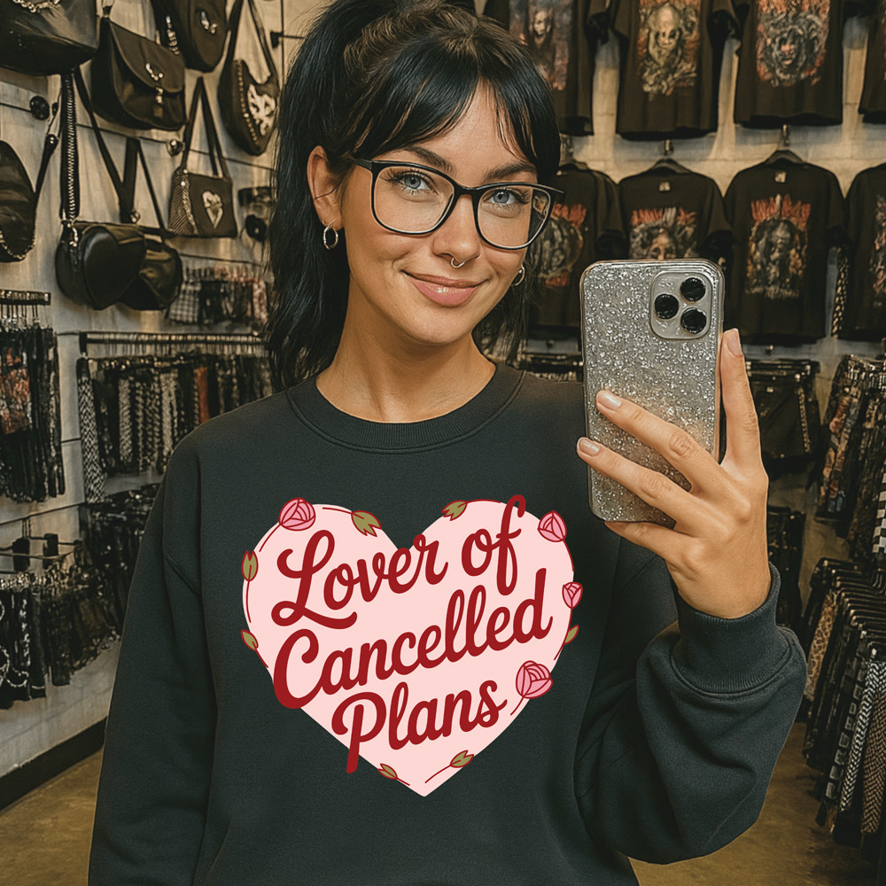 This sweatshirt features a bold heart-shaped graphic with the phrase “Lover of Cancelled Plans,” blending cozy humor with an effortlessly relatable vibe. The playful lettering and soft color palette make it perfect for anyone who loves staying in, saying no without guilt, and embracing their introvert era. It’s comfy, expressive, and made for everyday wear with personality.