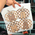 Fall coziness meets mama pride in this sweet graphic tee with four pumpkins in neutral gingham and checker patterns, each spelling out a letter in “MAMA.” Perfect for autumn-loving moms who live for pumpkin spice and harvest season memories.