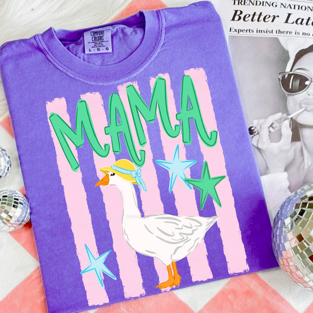 A fun and playful twist on a classic mama graphic, this design features bold “MAMA” lettering paired with a charming goose illustration dressed in a sweet little hat. Set against soft vertical stripes with scattered stars, it brings together a mix of whimsical, cottage-inspired detail and bright, eye-catching color. The combination of soft pastels and bold accents gives it a lighthearted, feel-good vibe that stands out while still feeling easy and wearable.