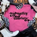 This design blends a bold message with a vintage-inspired, slightly western edge. “Normalize Sobriety” is styled in a flowing, retro script that feels both strong and expressive, with just enough distressing to give it that worn-in, lived-in character. The lettering has a confident presence without feeling harsh—more like a statement that speaks for itself.