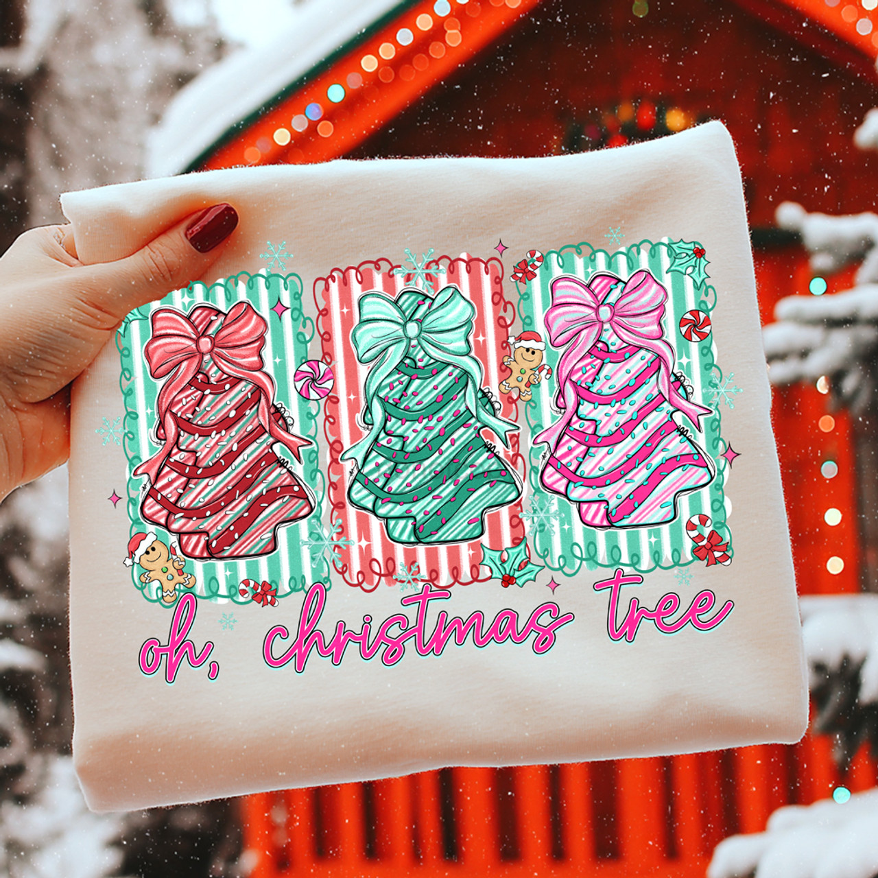 Bring the holiday magic to life with this playful “Oh, Christmas Tree” design featuring three candy-colored Christmas trees, each topped with a big festive bow. The striped backgrounds in red and green add a candy cane feel, while gingerbread cookies, peppermints, and holly berries sprinkle extra sweetness around the edges. With its mix of bright pinks, peppermint swirls, and whimsical doodles, this design captures the joyful, over-the-top spirit of Christmas in the cutest way possible.