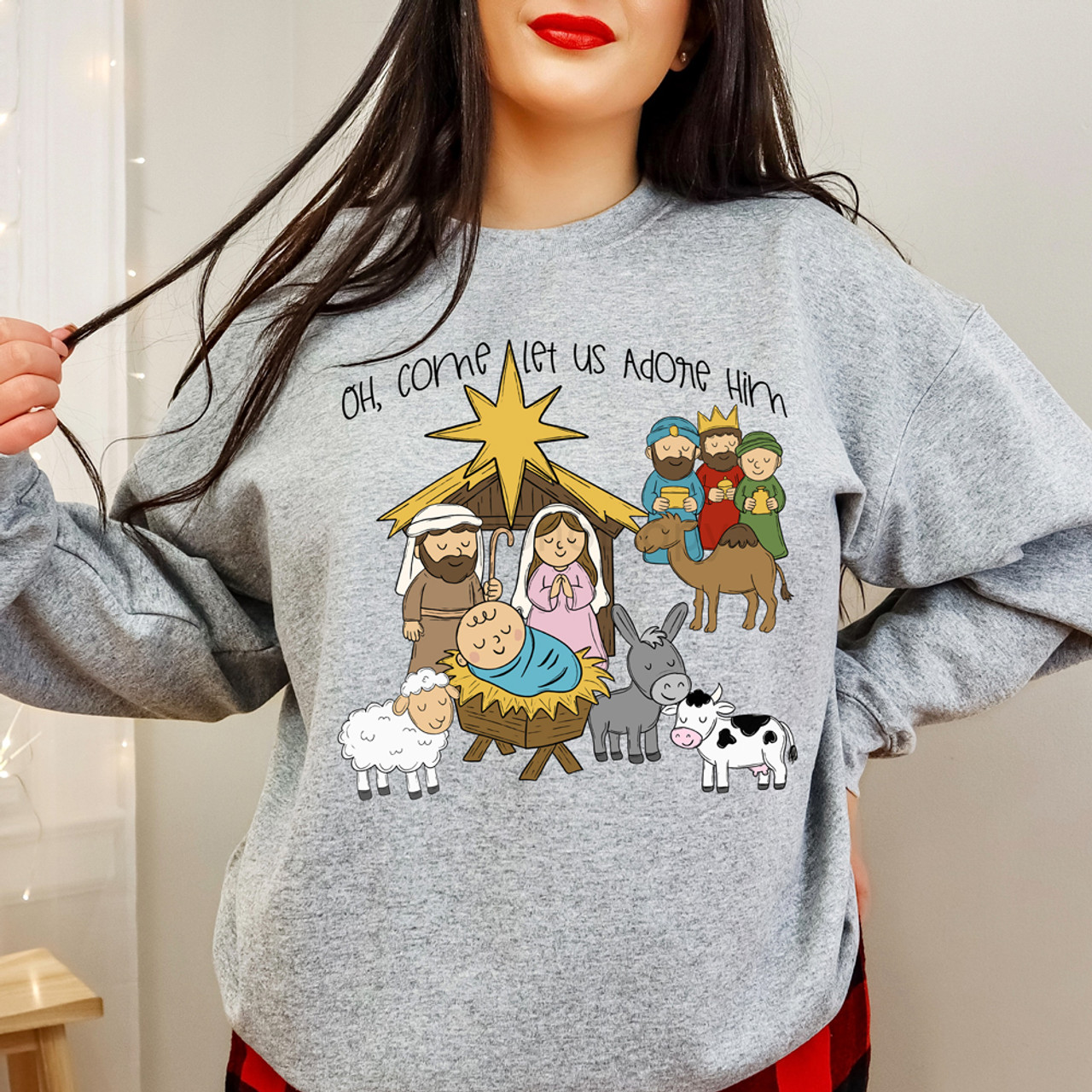 Celebrate the heart of Christmas with this sweet and meaningful “Oh Come Let Us Adore Him” design. Featuring a charming cartoon-style nativity scene complete with Mary, Joseph, Baby Jesus, the Wise Men, and a few adorable stable animals, this graphic captures the warmth and wonder of that holy night. The playful art style gives it a lighthearted, family-friendly feel, while the message keeps the focus on faith and joy. Perfect for church events, family gatherings, or simply sharing the reason for the season in a fun and festive way.
