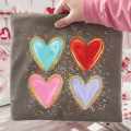 This design is a playful mix of color, texture, and feel-good charm. Featuring four painterly hearts outlined in shimmering gold accents, it brings a cheerful, artsy vibe that feels both modern and whimsical. The soft brushstroke style paired with scattered pops of color gives this piece a hand-painted look that stands out while still feeling effortless and wearable.