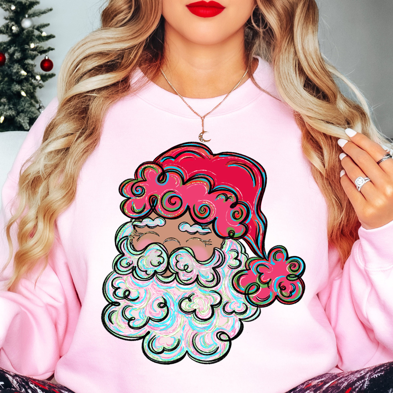 Bring a little color and a whole lot of cheer to your holiday wardrobe with this faux Painted Pink Santa design. Featuring a whimsical hand-painted look, Santa comes to life with swirly strokes of pink, mint, and red that give his beard and hat a fun, artistic twist. The pastel tones and bold black outline make this design pop in true boutique fashion—perfect for anyone who loves a playful, feminine take on Christmas classics. From cookie swaps to cozy nights by the tree, this Santa is full of charm, color, and Christmas magic.