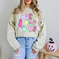 Bring the fun side of fright night to life with this pastel “Spooky” sweatshirt! Adorable candy-colored ghosts float between playful bubble letters, while pops of stars and a glittery bow add the sweetest touch of Halloween magic. It’s the perfect mix of cute and festive for pumpkin patch strolls, trick-or-treat events, or cozy October nights in. Who says spooky can’t be charming?