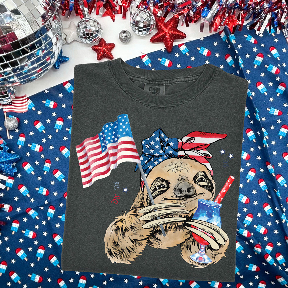 This design brings laid-back patriotism with a playful twist. Featuring a carefree sloth dressed in red, white, and blue, it captures that relaxed, celebrate-your-own-way energy that customers love for summer holidays. The bold artwork balances humor and Americana, making it an easy standout for Fourth of July, lake days, backyard parties, and casual weekend wear.
