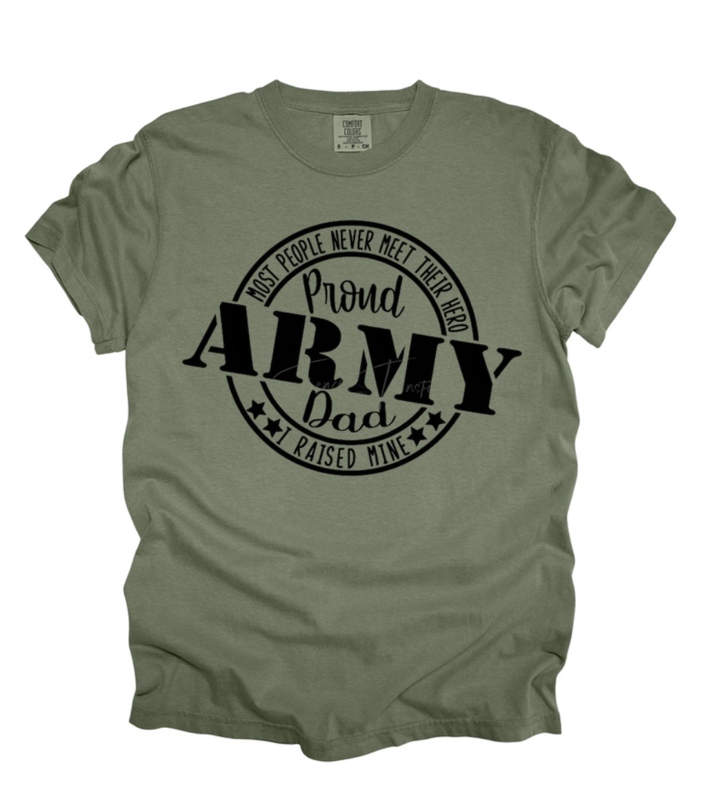 A bold and meaningful design featuring “Proud Army Dad” in strong, statement lettering with a classic circular layout. The clean, minimal style keeps the focus on honoring and pride, while the timeless design gives it an everyday, easy-to-wear feel. It’s a simple yet powerful way to show support and appreciation.