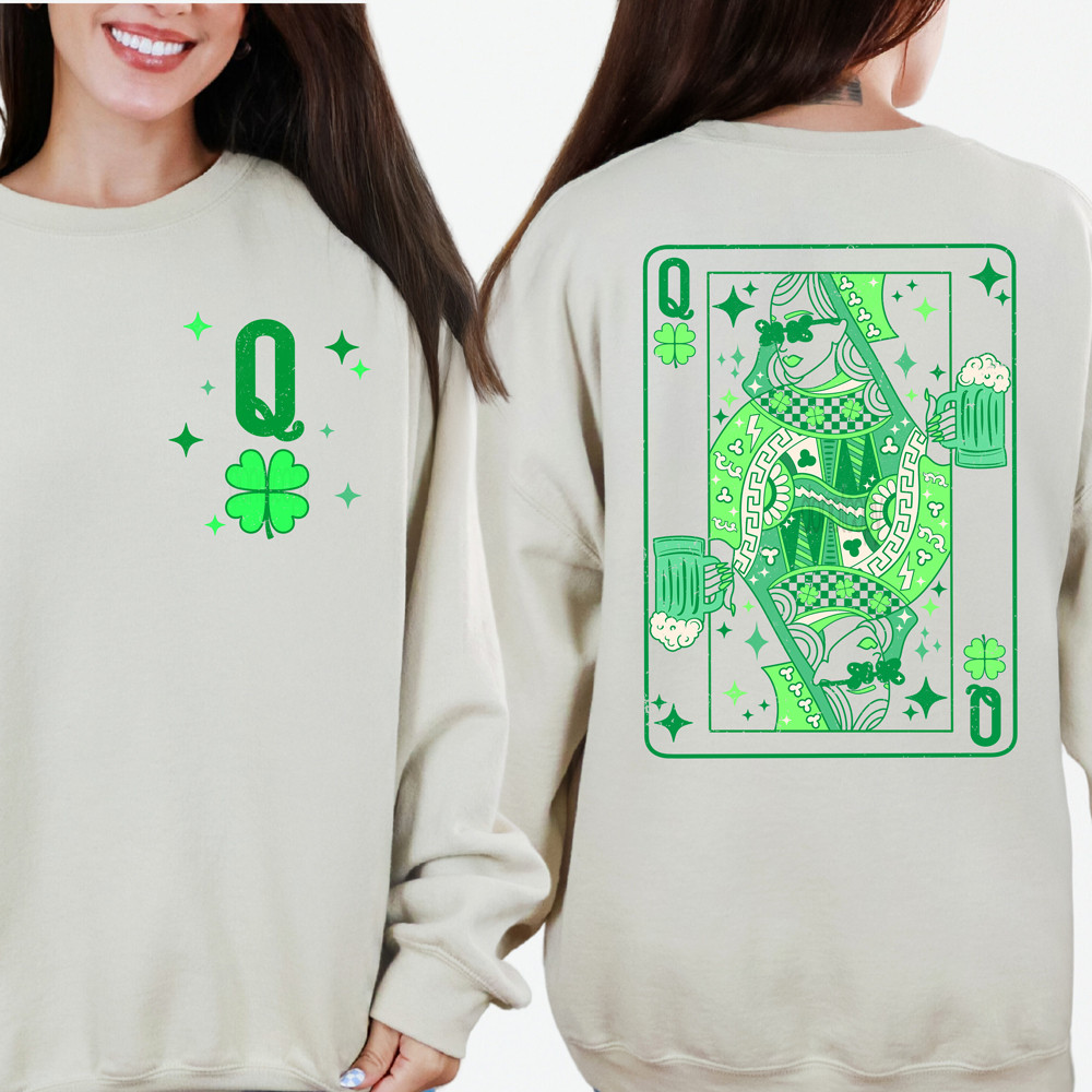 This piece is all about lucky energy with a bold, playful edge. The front keeps it minimal with a clean shamrock and “Q” detail, while the back steals the show with a full Queen-of-Luck card graphic packed with clovers, mugs, and vibrant green accents. The oversized card artwork gives it a statement feel without being loud, blending classic St. Patrick’s Day vibes with a trendy, slightly edgy aesthetic. It’s fun, confident, and made for those who like their luck served bold.