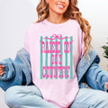 This design leans all the way into nostalgia with a bold, feel-good tribute to classic country roots. “Raised on 90’s Country” stands front and center in a distressed, vintage-style font that gives it that perfectly worn-in, lived-through feel. The soft pink lettering pops against vertical teal stripes, creating a fun contrast that feels both retro and fresh at the same time. A simple bow detail at the top adds a subtle feminine touch, tying the whole look together with a hint of charm. It captures that era of storytelling songs, small-town memories, and windows-down summer drives—easygoing, a little sentimental, and full of personality.