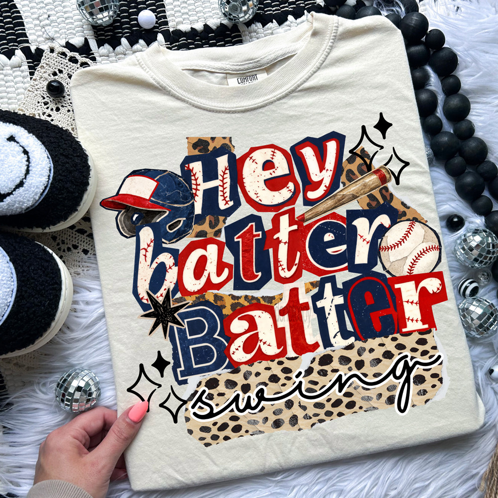 This design is for the moms, fans, and ballpark regulars who live for game day energy. “Hey Batter Batter Swing” is layered with bold varsity-style lettering, playful leopard accents, and classic baseball details that give it a sporty look with just the right boutique twist. It feels spirited without being over-the-top, making it an easy grab for practices, tournaments, and weekend games.