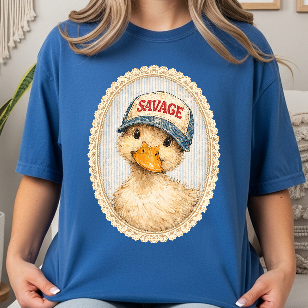A playful mix of vintage charm and humor, this design features a soft, storybook-style duck framed in delicate lace with a bold “SAVAGE” twist. The contrast between the sweet, classic illustration and the cheeky message gives it that perfect unexpected edge.