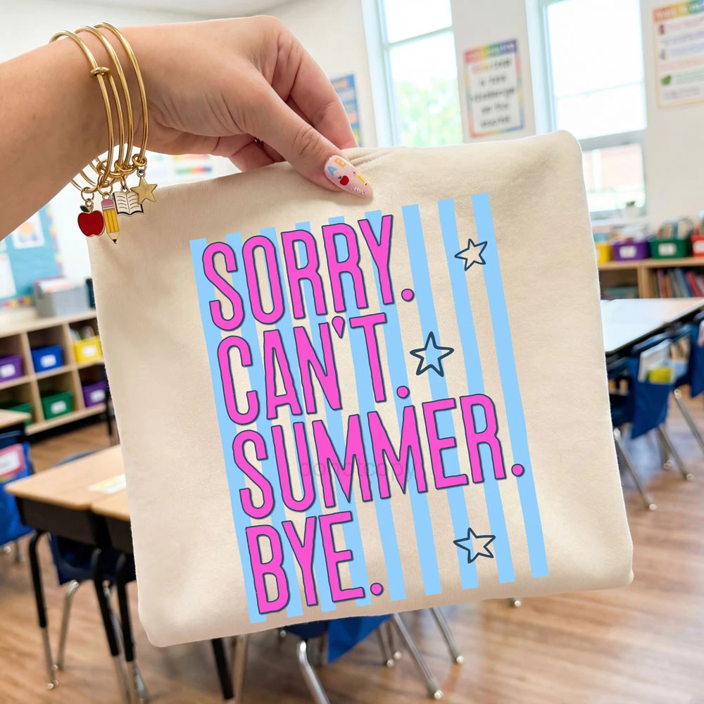 Bold, playful, and instantly relatable, this design features “Sorry. Can’t. Summer. Bye.” in stacked, eye-catching lettering that makes the message loud and clear. Set against soft striped accents with simple star details, it brings a fun mix of sass and seasonal excitement. The bright color contrast and clean layout give it a fresh, energetic feel—perfect for celebrating that end-of-school, hello-summer mindset.