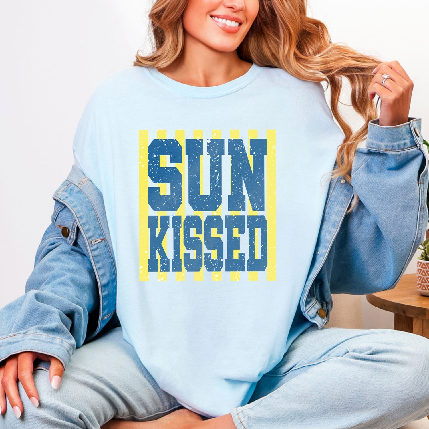 A bold, retro-inspired design that brings all the sunny, carefree energy. “Sun Kissed” stands out in a distressed block font layered over soft yellow stripes, giving it that perfectly worn-in, vintage feel. The color combo has that warm, golden glow—like long beach days, sunkissed skin, and summer that never quite ends. It’s simple, eye-catching, and effortlessly captures that laid-back, feel-good vibe.