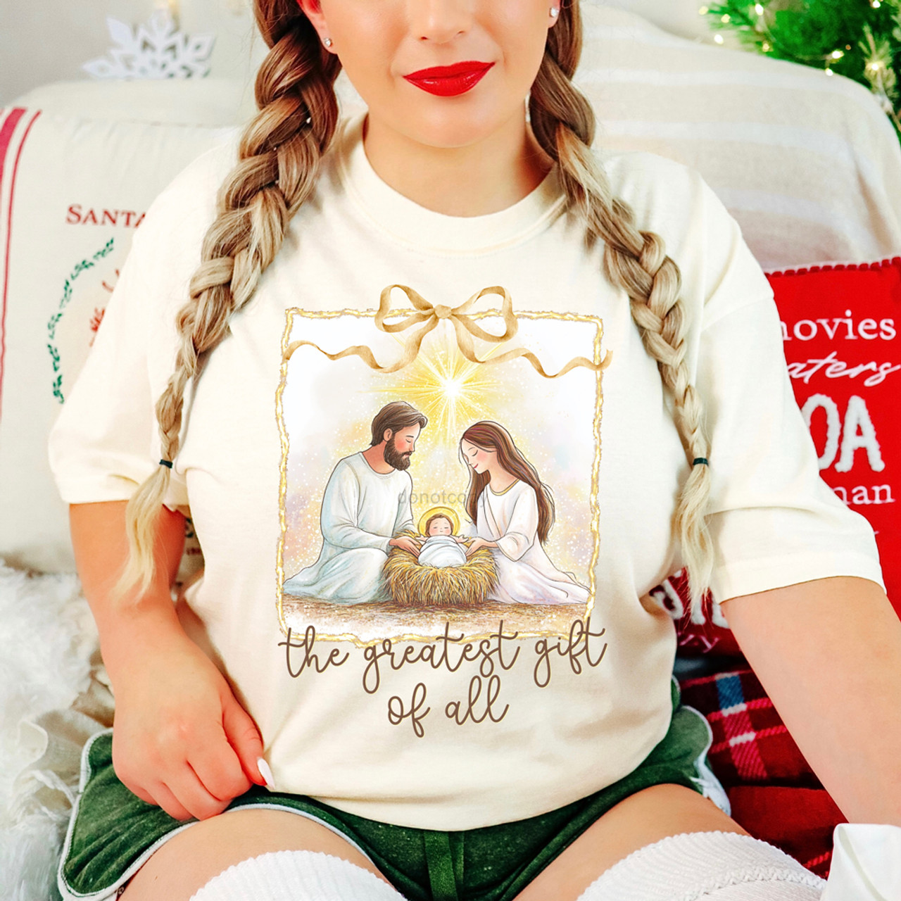 Celebrate the true meaning of Christmas with this heartfelt Greatest Gift of All design. Featuring a beautifully illustrated nativity scene framed in soft gold tones and topped with a delicate ribbon, it captures the peaceful moment of Christ’s birth in radiant detail. The gentle glow of the star above and the warm, serene expressions of Mary and Joseph create a sense of reverence and joy. This design is perfect for those who love to share their faith and keep Christ at the center of their holiday celebrations. Elegant, timeless, and filled with purpose — a boutique favorite for the season.
