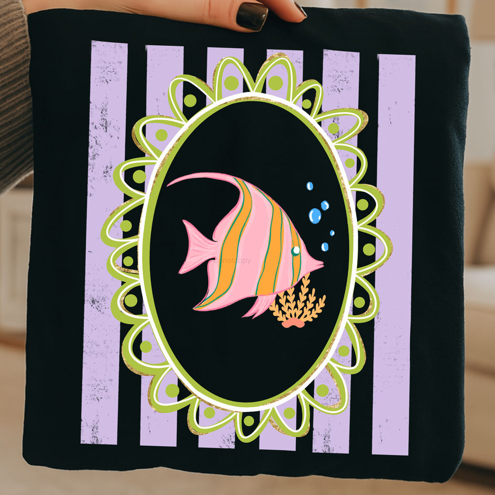 A unique blend of coastal charm and bold, boutique-style design, this graphic features a colorful tropical fish framed in a decorative oval with layered details and soft contrast stripes in the background. The mix of playful colors, subtle texture, and ornamental accents gives it a slightly vintage, artistic feel while still keeping things bright and fun. It’s eye-catching without being loud—perfect for adding a little seaside-inspired personality to everyday style.