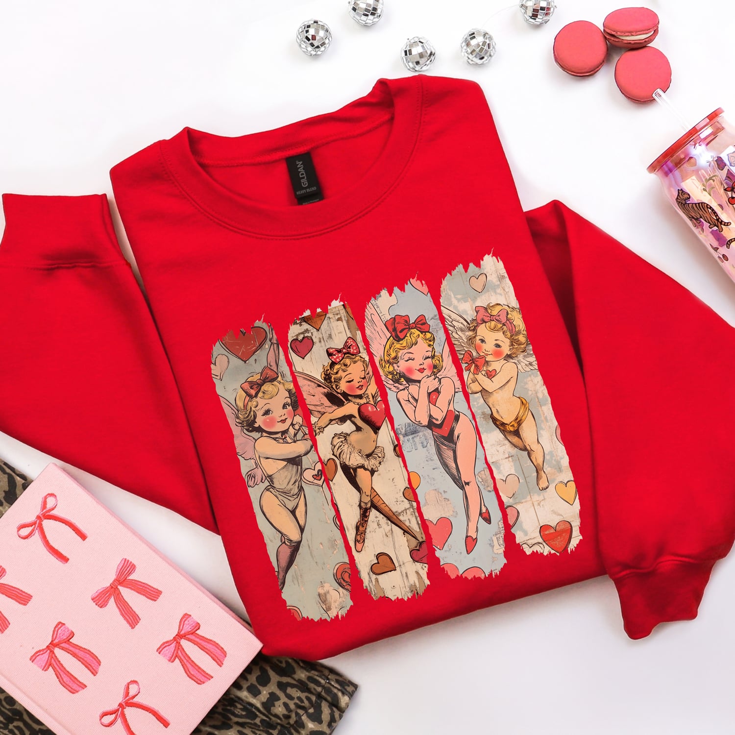 A vintage-inspired collage featuring playful cupid illustrations and soft, romantic details that give this design a nostalgic Valentine vibe. The layered artwork feels whimsical yet timeless, making it an easy statement piece that stands out without feeling overdone.