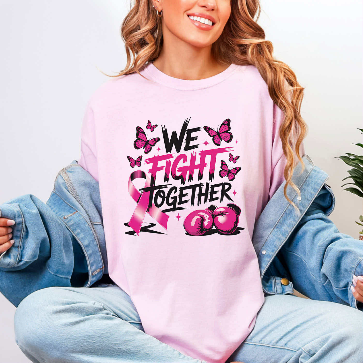 This tee is more than just apparel—it’s a statement of strength, solidarity, and support. Featuring bold lettering with the words “We Fight Together”, pink boxing gloves, butterflies, and the iconic awareness ribbon, this design symbolizes unity in the fight against breast cancer. Perfect for showing love to survivors, warriors, and supporters, it’s a powerful reminder that no one battles alone.