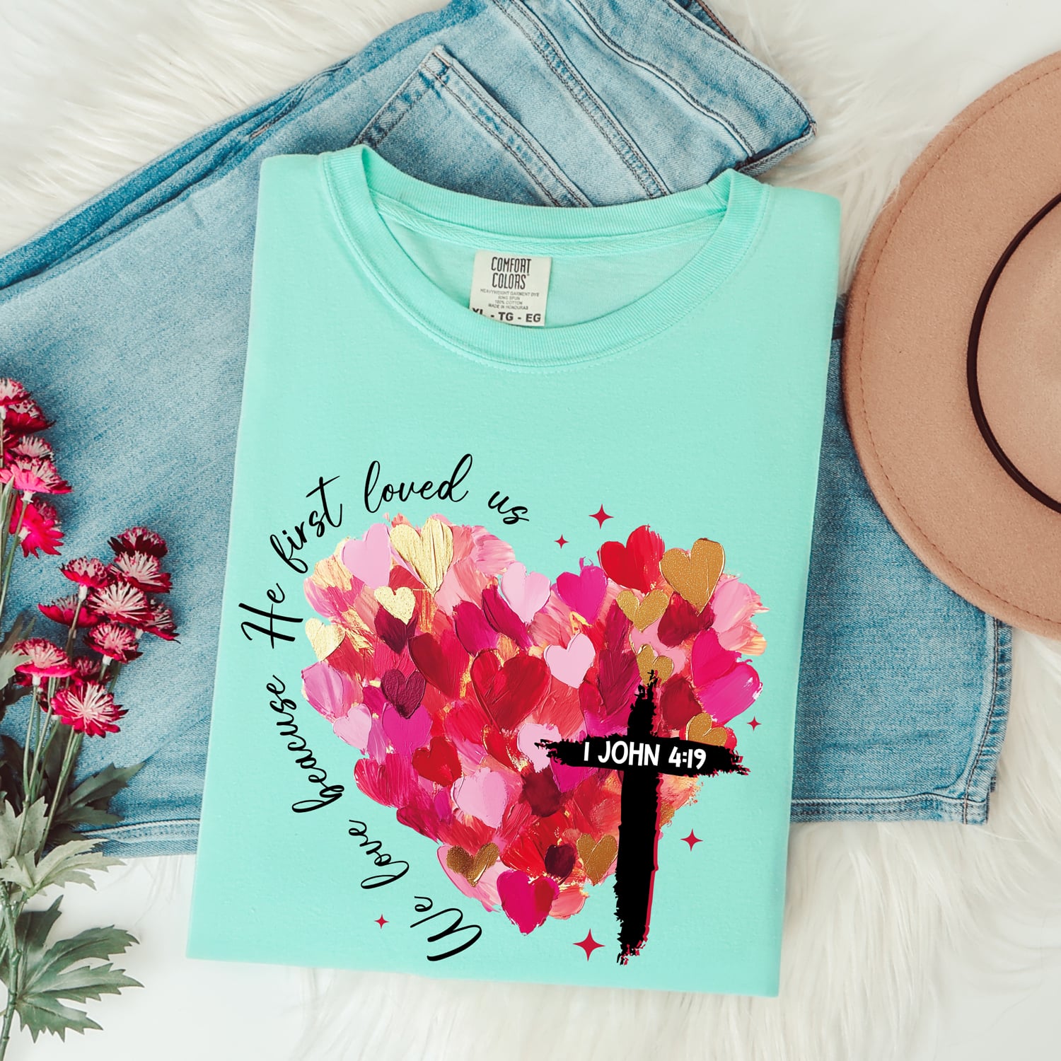 This faith-filled design centers on a vibrant, painterly heart made up of layered brushstroke textures and faux metallic accents, creating depth and warmth. The handwritten-style scripture wraps gently around the heart, while the bold cross detail grounds the message with quiet strength. It’s expressive without being loud—artful, meaningful, and full of intention.